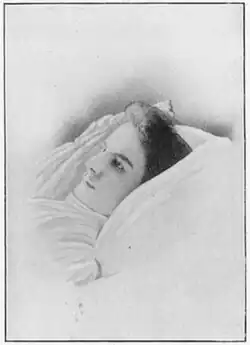 During the early years of her life, she gave little promise of poetic talent, and her parents never suspected that she had it. Apparently, her only training in verse-making was that of suffering. As she lay in her sick bed, there came to her an inspiration which resulted in the composition of a poem, entitled "A Song in the Night". This, her first effort, occurred about three months after she had taken to bed. It was followed by many other verses. She dictated her verses to her father as he knelt next to her bed. He was obliged to put his ear to her lips to catch her words, so weak was she while dictating to him.[9] Many of her verses —her "messages," as she called them— came to her when she was in a state of almost complete physical exhaustion.[2] Her mind was specially vigorous in composition as she passed into or recovered from the severe attacks which seized her, any one of which might have proved fatal.[5]
