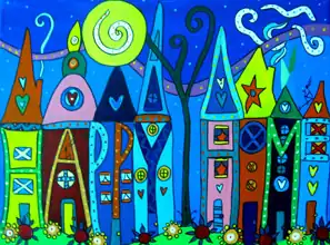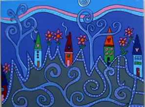 In 2001 Steinberg began turning her 'doodles' into multi-media pieces of fine art. Her work is mostly bright acrylic pieces with words inside the images (pictures below).