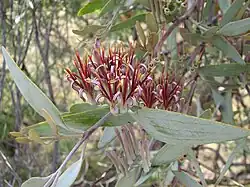 The hybridisation of this species with Amyema pendula, rare amongst Loranthaceae, has produced first generation hybrids.[7]