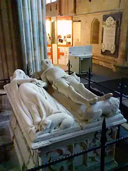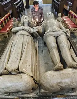 The tomb monument in Chichester Cathedral is now widely, though not quite certainly, identified as that of Richard FitzAlan, 10th Earl of Arundel (d. 1376) and his second wife, Eleanor of Lancaster (d. 1372).[2][3][4][5] The couple were buried in the chapter house of Lewes Priory, and their monument may have been fashioned by the master mason Henry Yevele: documentary evidence survives relating to the shipping of two "marble" tombs for them in January 1375 from Poole Harbour to London at Yevele's behest.[6][7][4] Having first been erected at Lewes Priory, the effigies were probably moved to Chichester following the priory's dissolution in 1537. The earliest certain record of their presence in the cathedral dates from 1635.[2][3][8]
