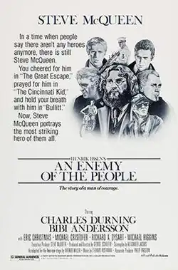 An Enemy of the People is a 1978 American drama film directed by George Schaefer and based on Arthur Miller's 1950 adaptation of Henrik Ibsen's 1882 play. The film stars Steve McQueen in the lead role of scientist Thomas Stockmann, Charles Durning as his brother Peter, and Bibi Andersson as his wife Catherine.[2][3][4][5][6]