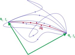 where the departure t1 and arrival t2 times are fixed.[1] The term "path" or "trajectory" refers to the time evolution of the system as a path through configuration space , in other words q(t) tracing out a path in . The path for which action is least is the path taken by the system.