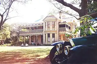 The front garden has a simplified late 19th century layout. It is defined by its enclosing hedges and is dominated by the carriage loop, mature silky oaks, jacarandas, araucarias and brachychitons. More recent additions are tallow trees (Sapium sebiferum) which are in the process of being pleached. To the rear of the house are of the house are mature figs, stone pines (Pinus pinea) and African olives. There is an intimate courtyard featuring palms and a fountain linking the kitchen area and billiard room and which acts as the informal entrance to the main house.[1]