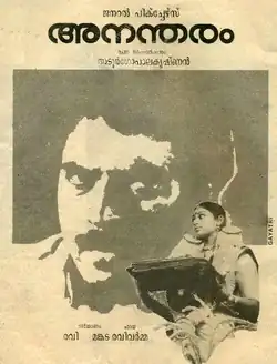 Anantaram (Malayalam: അനന്തരം, transl. Thereafter), also known as Monologue, is a 1987 Indian Malayalam-language psychological drama film produced, written and directed by Adoor Gopalakrishnan. It stars Ashokan, Shobhana and Mammootty in the lead. The film is structured like a monologue. It develops through a commentary by the protagonist about himself in the first person. The attempt of the protagonist is to narrate how his undiagnosed psychosis led him where he is now. The film was an experimental film for its time as it did not have a linear narrative.[1][2]