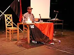 The movement re-entered global view when a number of anarchist groups took part in the 2011 Egyptian revolution, namely the Egyptian Libertarian Socialist Movement and Black Flag.[17] The Egyptian anarchists have come under attack from the military regime and the Muslim Brotherhood.[18][19][20] On October 7, 2011, the Egyptian Libertarian Socialist Movement held their first conference in Cairo.[21]