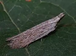 The wingspan is 12–15 mm. The forewings are grey-whitish, finely irrorated with fuscous, often with some black scales, occasionally much suffused with dark fuscous; several short oblique dark fuscous costal marks, one in middle largest; stigmata sometimes indicated by black dashes; often a black terminal spot below apex. Hindwings are light grey. The larva is dark brown; head and plate of 2 black [2]