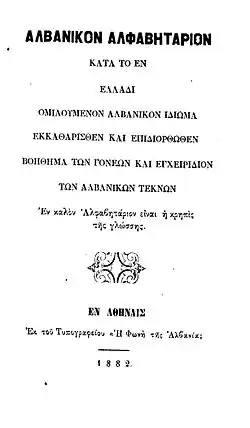 - Αλβανικόν Αλφαβητάριον, (English: Albanian Primer Athens, 1882);