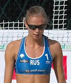Anastasia Gennadyevna Vasina (Russian: Анастасия Геннадьевна Васина; born 18 December 1987)[2] is a Russian beach volleyball player. As of 2012, she plays with Anna Vozakova. They competed at the 2012 Summer Olympics in London. They are the first representatives of Russia in beach volleyball competing in the Olympics. In the first round of the games, the Russians pulled an upset against the match favorites Xue Chen and Zhang Xi from China[3][4] and qualified to the next round as first in their group but were eliminated by the Austrian team in the round of 16. Vasina currently plays with Alexandra Moiseeva.[5]