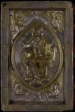 This parchment manuscript still has its original, richly decorated binding made of oak covered with silver. The front cover, which is incomplete, originally depicted a crucified Jesus and his mother Mary, St John and a figure indicated as “Anastasia”. The figure of Christ on the cross was torn off by the Swedes during the Swedish Invasion of Poland in 17th century.[3] On the back cover is a representation of Maiestas Domini: Christ, sitting on a mensa-shaped throne, administers a blessing with his right hand and holds a closed book in his left hand.[1]