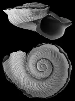The teleoconch displays a flattened upper spire and a disk-shaped outline, with strongly protruding margins of the selenizone. The surface is marked by flexuous axial ribs. The aperture is pear-shaped and features a distinct slit, while the suture is deep. Shell dimensions are: height 1.3 mm, width 2.1 mm, and aperture height 0.85 mm (60% of total shell height). The shell is an opaque grayish white.