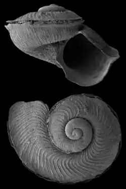 There are 2¼ regularly coiled whorls with convex shoulder areas and a rounded base. The selenizone is positioned above the periphery, and the distance between the base of the selenizone and the suture is small but increases progressively.
