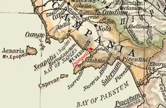 The main inhabited centers of this historical region were (from north to south) Capua, Atella, Liternum, Cumae, Baiae, Puteoli, Acerrae, Nola, Neapolis, Caprae, Oplontis, Pompei, Sorrentum, Stabiae, Nuceria Alfaterna and Salernum. Thanks to the fertility of the soil, also due to the presence of the Volturno river, it earned the name of Campania Felix.[3]