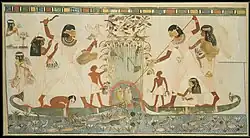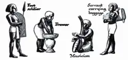 Egyptian society was highly stratified, and social status was expressly displayed. Farmers made up the bulk of the population, but agricultural produce was owned directly by the state, temple, or noble family that owned the land.[76] Farmers were also subject to a labor tax and were required to work on irrigation or construction projects in a corvée system.[77] Artists and craftsmen were of higher status than farmers, but they were also under state control, working in the shops attached to the temples and paid directly from the state treasury. Scribes and officials formed the upper class in ancient Egypt, known as the "white kilt class" in reference to the bleached linen garments that served as a mark of their rank.[78] The upper class prominently displayed their social status in art and literature. Below the nobility were the priests, physicians, and engineers with specialized training in their field. It is unclear whether slavery as understood today existed in ancient Egypt; there is difference of opinions among authors.[79]