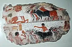 Ancient Egyptian cattle were of four principal different types: long-horned, short-horned, polled and zebuine.[17] The earliest evidence for cattle in Egypt is from the Faiyum region, dating back to the fifth millennium BC.[17] In the New Kingdom, hump-backed zebuine cattle from Syria were introduced to Egypt, and seem to have replaced earlier types.[17]