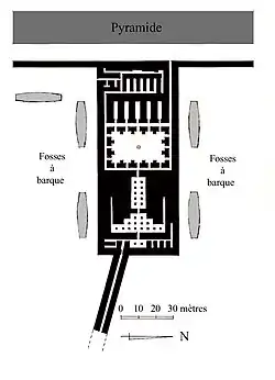 The Pyramid of Unas in North Saqqara has two boats.[45] One the boat pits is 44 meter long and is located 150 meter away from Unas' funeral temple. The boats are lined with limestone blocks and are situated east to west, as many solar ships are.[46] The two boat pits are next to each other.[29]
