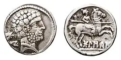 Along the east coast and particularly in the northeast a great number of towns minted silver drachmas. Some of these coins imitate the drachmas of Emporion or Massalia, while others have Iberian legends, a few of which can be related to towns or peoples but many of which are unknown or illegible.[25] This silver coinage is generally seen as minted by the pro-Roman side, particularly as little Roman coin seems to have reached the Peninsula given the concurrent fighting in the Italian Peninsula.[26] But given the fluid situation of the war, particularly in the early years, some of these emissions may have been minted to aid the Carthaginian cause.[27]