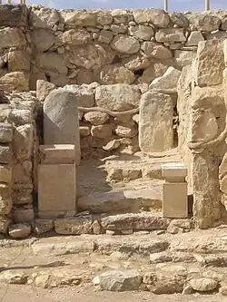 Places of worship referred to as high places (Hebrew: במה bamah and plural במות bamot or bamoth) were found in many towns and villages in ancient Israel as places of sacrifice.[52] From the Hebrew Bible and from existing remains a good idea may be formed of the appearance of such a place of worship. It was often on the hill above the town, as at Ramah (1 Samuel 9:12–14); there was a stele (matzevah), the seat of the deity, and a Asherah pole (named after the goddess Asherah), which marked the place as sacred and was itself an object of worship; there was a stone altar (מִזְבֵּחַ mīzbēaḥ "slaughter place"), often of considerable size and hewn out of the solid rock or built of unhewn stones (Exodus 20:21), on which offerings were burnt; a cistern for water, and perhaps low stone tables for dressing the sacrifices; sometimes also a hall (לִשְׁכָּה līškā) for the sacrificial feasts. Ancient Israelite religion was centered on these sites; at festival seasons, or to make or fulfil a vow, an Israelite might journey to more famous sanctuaries at a distance from home, but ordinarily offerings were made at the bamah of his own town.[53]