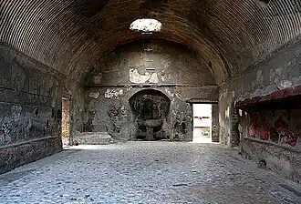 Most baths contained an apodyterium— a room just inside the entrance where the bather stored their clothes. This would often be the first room somebody visiting the baths would enter. Next, the bather progressed into the tepidarium (warm room), then into the caldarium (hot room) for a steam, and finally into the frigidarium (cold room) with its tank of cold water. The caldarium, heated by a brazier underneath the hollow floor, contained cold-water basins which the bather could use for cooling. After taking this series of sweat and/or immersion baths, the bather returned to the cooler tepidarium for a massage with oils and final scraping with metal implements called strigils. Some baths also contained a laconicum (a dry, resting room) where the bather completed the process by resting and sweating.[7]