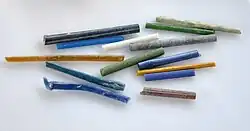 Across the sea, Mycenaean glass beads were found to have been made with glass from both regions. The fact that the beads are stylistically Mycenaean would imply an import of raw glass.[2] Archaeological evidence for this trade comes from the Uluburun shipwreck, dated to the late 14th century BC. Part of its cargo consisted of the earliest known intact glass ingots: about 175 ingots of cylindrical shape, in blue shades from lavender to turquoise, as well as uncolored ones.[7] Some ingots chemically match the glass found in the Egyptian production sites; specifically, they match by shape the melting crucibles found at Amarna.[8]