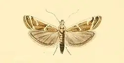Adults are small, with narrow ochreous yellow forewings. It has a white costal streak and two white transverse lines. The hindwings are pale grey.[4]