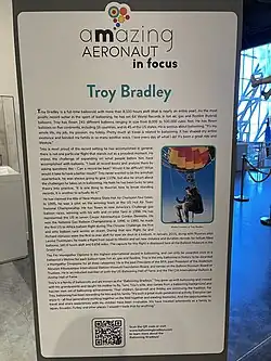 Several notable displays include Women's Contribution to the History of Ballooning, Sid Cutter's influence on the Albuquerque Ballooning Industry, and a Troy Bradley Pilot Spotlight for his significant experience flying and numerous awards.
