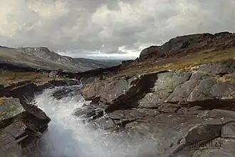 He used this money to attend the Academy of Fine Arts, Karlsruhe, where he studied under Hans Fredrik Gude from 1871 to 1876; serving as his assistant during the last three years.[2] After that, he returned to Norway and remained there until his death, although he often spent his summers working in Switzerland.