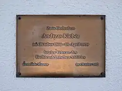 In his later years, he was honoured with photographs of him in his uniform which were used in various postcards. Kieber died on 19 April 1939 in Mauren, aged 94 years old.[1] Upon his death, he was recognised as the last surviving member of the Liechtenstein military and nicknamed the "last Liechtenstein soldier".[1][3]