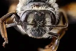 Andrena are generally medium-sized bees; body length ranges between 8 and 17 mm with males being smaller and more slender than females. Most are black with white to tan hair, and their wings have either two or three submarginal cells. They carry pollen mainly on femoral scopal hairs, but many Andrena have an additional propodeal corbicula for carrying some pollen on their thorax.[5] They can be distinguished from other bees by the broad velvety areas in between the compound eyes and the antennal bases, called facial foveae. Some other genera in the family Andrenidae also have foveae though, so the best identifying feature unique to Andrena is the presence of a ring of hairs on the underside of their face called the "subgenal coronet".[3]