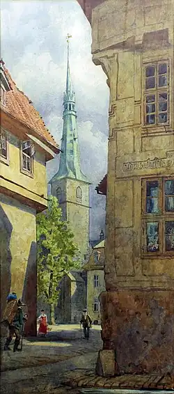 Andrew Brown Donaldson studied at the Royal Academy of Arts in London and he also underwent a period of training in Rome. In 1872 he was married at St. Pancras in London to Agnes Emily Twining, the youngest daughter of the well-known tea merchant Richard Twining (III) of Messrs R. Twining & Co. - Twinings - in the Strand. They had six children.[1] Andrew's oil and watercolour paintings, the style of which was heavily influenced by the Pre-Raphaelite movement, primarily depict either actual landscapes or imagined scenes from history and mythology. Although based in London, living first in Kensington and latterly in Hampstead, Andrew Brown Donaldson frequently toured through mainland Europe in search of new scenes and inspiration, often accompanied by his wife and children. The London Metropolitan Archives holds a set of diaries kept jointly by Andrew and Agnes from the start of their marriage until the time of their deaths and they offer a vivid snapshot of domestic life in an upper-middle-class family in Victorian and Edwardian London.[2]