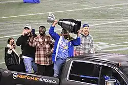 Harris helped the underdog Blue Bombers win their first Grey Cup since 1990 against the Hamilton Tiger-Cats in the 107th Grey Cup game.[32][33] He became the first ever player to win Most Valuable Player and Most Valuable Canadian in Grey Cup history after he recorded 18 carries for 134 rushing yards, five catches for 35 receiving yards, and both a rushing touchdown and a receiving touchdown.[34] Following the win of his hometown team Harris said "I'm so proud to be a Winnipegger and I can't wait to get back and share this with all them. I just wanted to prove it to my teammates and deliver for them. Everything else, whatever. I just wanted to be the best player I could be today."[32]