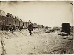 Russell took his first photographs with a camera that he borrowed from Fowx and Colonel Herman Haupt. Haupt used Russell's photographs to illustrate his reports. Haupt arranged to have Russell removed from his regiment on March 1, 1863, so that he could photograph for the United States Military Railroad and the Quartermaster Corps, until he mustered out in September 1865.[2] Russell was the only military officer to photograph for the War Department during the American Civil War. He is perhaps best known for "Confederate dead Behind the Stone Wall" and another photograph stated before taken during the Battle of Chancellorsville on May 3, 1863.