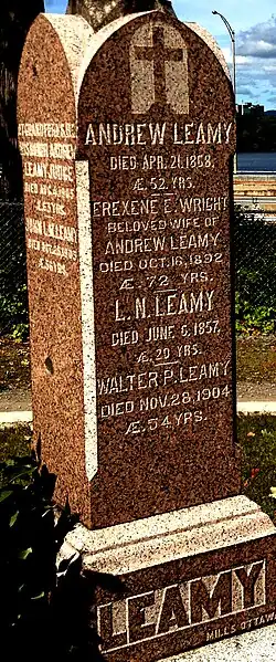 Andrew Leamy is buried in a piece of land that he had donated to the Church for the purpose of creating Notre Dame Cemetery in Gatineau, Quebec. His resting place can be found in a rear portion that overlooks the lake that today still bears his name. At his feet lie the remains of a young man named George Smyth. The stone that marks his grave is inscribed with the words: