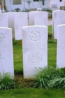 In late 1945, de Breyne started the process of gaining recognition for Mynarski's extraordinary deed by recommending an award and enquiring about the location of his grave. Although facing some initial resistance, the recommendation worked its way up the command structure of the RCAF and RAF. On 11 October 1946, a Victoria Cross was posthumously awarded for "valour of the highest order" to Andrew Charles Mynarski, by then also awarded the rank of pilot officer.[10][11]