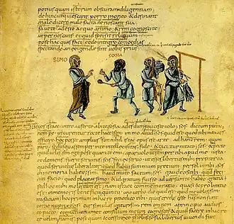 According to the ancient commentator Donatus, the characters of Charinus and Byrrhia were not in the original Menander play, but were copied by Terence from a different Menander play (the Perinthian) so that Philumena would not be left without a husband when Pamphilus married Glycerium.[2] Another part of the Perinthian apparently used by Terence was the dialogue in the first scene, with the substitution of the freedman Sosia for the old man's wife. It seems that the original Andrian of Menander began with a soliloquy.