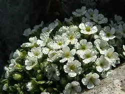 Androsace helvetica is a plant in the family Primulaceae. Androsace helvetica is widely distributed in the Alps, where it is absent from areas with siliceous bedrock and is rare and scattered in the south-eastern Alps east of the Dolomites. Several occurrences are known from the central Pyrenees. It is a characteristic species of alpine and subnival communities on dry and exposed limestone rocks or calcareous schists. It forms dense, often hemispherical cushions, with imbricate dead leaves below the leaf rosette and exclusively simple hairs on the leaves.[3]