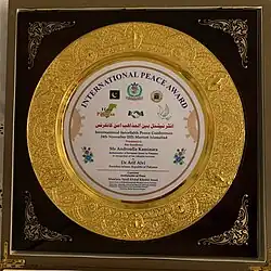 On 24 November 2021, Androulla Kaminara was awarded the International Peace Award in recognition of her services for the cause of interfaith harmony during the International Interfaith Peace Conference[31] in Islamabad organized by the Interfaith Council for Peace and Harmony and Majlis Ulema-e-Pakistan with financial support by the EU Delegation. The award was presented by President of Pakistan Dr. Arif Alvi, co-convener of the conference.[32][33][34]