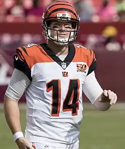Andrew Gregory Dalton (born October 29, 1987) is an American professional football quarterback for the Carolina Panthers of the National Football League (NFL). Nicknamed "the Red Rifle", he played college football for the TCU Horned Frogs, where he became the school's leader in quarterback wins and won the 2011 Rose Bowl.[1] He was selected by the Cincinnati Bengals in the second round of the 2011 NFL draft.[2]