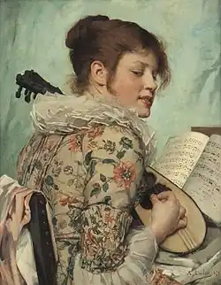 Born in 1844 in the department of Orne, Angèle learned painting in Paris as a pupil of the French painter Charles Chaplin (1825-1891).[1][2] Right from the start, the quality of her work attracted attention. Thus when she exhibited La Prière at the Salon of 1866, a columnist from the magazine Le Foyer said "... a talent that announced itself in such a naive and touching way, revealing serious and good qualities, auguring very well for the artistic future of Miss Dubos."[1]