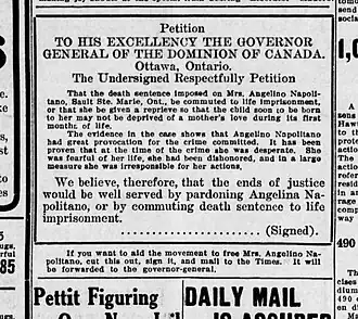 Once the story hit the newspapers, however, a media frenzy began—not just in Sault Ste. Marie, but especially in the United States[6] and even Europe.[2][3][5] Though some of the coverage was negative, arguing from racist stereotypes that Napolitano, as an Italian, was a "hot-blooded foreigner" and deserved to pay the penalty for her crime,[2] most of it revolved around those sympathetic to the abuse she had suffered, and agitating for her sentence to be commuted to jail time or even a pardon.[2] The federal minister of justice, Sir Allen Bristol Aylesworth, received many letters from individuals (including McFadden),[2] as well as petitions organized by groups in Sault Ste Marie, Toronto, New York City, Chicago, England, Austria, and Poland.[2] A doctor in Ohio, Dr. Alexander Aalto, even offered to be hanged in Angelina's place, saying: "It would only be fair to Mrs. Napolitano for a man to give his life for her, inasmuch as her life is in peril on account of a man's persecution of her, and because men condemned her."[8]