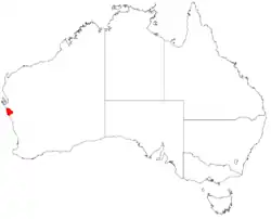 It is found in a small area on the west coast of Western Australia in the Mid West region from around Kalbarri and Northampton where it is commonly situated in damp or areas that are wet in winter growing in a variety of soils.