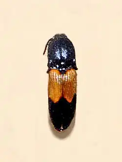 Body is oblong, parallel-sided and flattened. These beetles are characterized by a bicolorous black and orange or red coloration.[1]