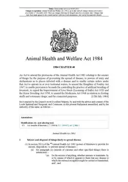 | Text of the Animal Health and Welfare Act 1984 as in force today (including any amendments) within the United Kingdom, from legislation.gov.uk. | |