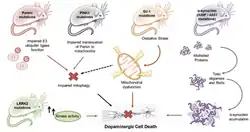 Pten-Induced Kinase 1 (PINK1) mutations are associated with autosomal recessive parkinsonism.[4] It is a neuroprotective kinase predominantly found in the mitochondria and cytoplasmic areas of the cell. PINK1 is also a serine/threonine protein kinase and is associated with the mitochondria.[20] PINK1, in research studies, is generally used as a knockout (KO) model. The mechanism of action of this gene involves the recruitment of the Parkin gene from the cytoplasm to the mitochondria. Once recruited, this leads to augmented ubiquitin activity and therefore induces mitophagy. Mitophagy is a pathway in which the mitochondria is degraded.[21] Both PINK1 and Parkin share functions in the same pathway, therefore, their activities are similar.[19] Some studies have demonstrated expression of the PINK1 mutation in rodents, inducing dopaminergic neuron loss and motor defects.[14] Other studies are more associated with PINK1 KO. PINK1 knockouts show reduction in dopamine levels in the striatum.[4] They express very low levels of dopaminergic neuron loss and do not present the formation of Lewy bodies. However, the KO models demonstrate mitochondria dysfunction and oxidative stress. On the other hand, studies are demonstrating loss of dopaminergic neurons and showing motor deficits in rats.[19]