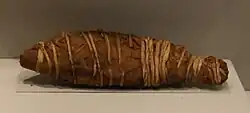 Egyptians believed that the afterlife would be a continuation of this one, allowing for the transportation of items from this life to the next.[11] In order to bring food to the afterlife, Egyptians would surround human mummies by what are known as victual mummies, made of edible animals.[12] These animals were prepared by dehydrating the meat and wrapping it in linen bandages, which indicated that the animals were food, not pets.[12] The victual animals were not mummified to the same meticulous extent that a pet or human would be, but they were nonetheless carefully preserved using natron and other special salts.[12] This food was included in tombs in order to sustain the deceased person's soul, called the ka, during the journey to the next world.[11] A variety of food has been found in many tombs, mostly breads, meats, and fowl.[11] King Tutankhamun's tomb held several coffin-shaped wooden boxes containing victual mummies, in his case duck and other types of meats.[11]