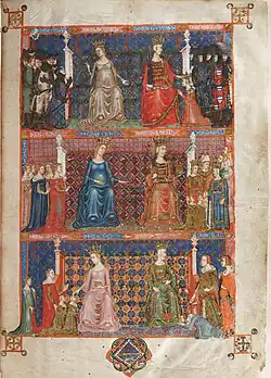 In the right miniature, a family tree emphasizes dynastic greatness. At the top are Charles I of Anjou and his spouse Beatrice of Provence, the founders of the Capetian House of Anjou in Naples and Sicily. He is surrounded by armored Neapolitan barons. Kneeling at his feet is his son and successor, the future Charles II. In the middle field of the miniature, Charles II and Maria of Hungary are depicted. Next to Maria are her daughters, and next to Charles II is Charles Martel, his eldest son, and a bishop with a halo, Saint Louis of Toulouse, his second son. Next to them is Robert I of Anjou in royal dress; kneeling at his feet are his two granddaughters, Joanna (who succeeded him) and her sister Maria. At the bottom of the third part of the miniature are Robert I of Anjou and his second wife Sancia of Majorca. To the left of the queen is Maria of Valois, Duchess of Calabria, with her two daughters, Joanna and Maria. Next to Robert is his son Charles of Calabria. This miniature illustrates the succession within the Angevin dynasty, and makes it clear that Robert had chosen his granddaughter Joanna to succeed him after the death of his son.[13]