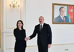 In September 2023, Baerbock accused Azerbaijan of breaking its promise not to resort to military action in Armenian-held Nagorno-Karabakh and called on it to halt the offensive and return to negotiations.[78] In February 2024, she played host to the foreign ministers of Azerbaijan and Armenia for two days of peace talks in Berlin.[79]