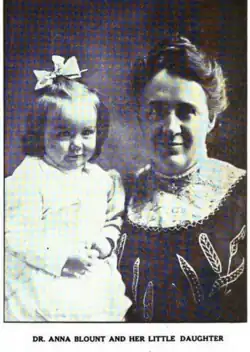 Anna Blount and her husband, Ralph Earl Blount, both worked at Hull House.[29] They lived in Oak Park, IL, and had three children: Walter Putnam,[30] Earl Ellsworth, and Ruth Amelia.[31] Both Walter and Ruth became doctors, with Ruth, who received her Doctor of Medicine degree from Northwestern University on June 16, 1934, being one of the women "encouraged ... to become physicians" by her mother, as has been referred to above.[32][33]