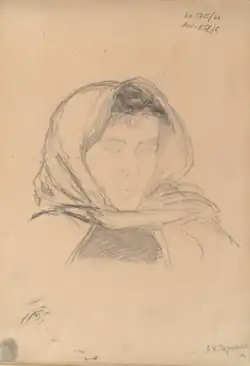 Nikolai Yaroshenko knew Anna Chertkova well and corresponded with her. There are two published letters from Yaroshenko to Chertkova: from November 8, 1894 from Kislovodsk[59] and from January 9, 1896 from St. Petersburg,[60] as well as a letter addressed to both spouses simultaneously from December 8, 1897 from St. Petersburg.[61] The artist was interested in her health and her son's achievements in numerous letters to Vladimir Chertkov.[62] In the collection of the Memorial Museum of N. A. Yaroshenko there is a photograph of Vladimir and Anna Chertkovs, who were at the artist's summer house in Kislovodsk in 1890.[63] There are also the drawings of Anna Chertkova made by the artist in that year: "A. K. Chertkova on the balcony" (paper, Italian graphic pencil, 17.5 × 13.3 cm, the drawing is signed by son Vladimir "Sketch of my mother by Yaroshenko")[64] and "Chertkov family friendly caricature" (paper, cardboard, graphic pencil, 20 × 23 cm).[65]
