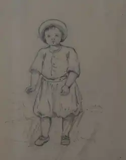 - Vladimir Vladimirovich (his family called him Dima, 1889-1964).[48] Nikolai Yaroshenko depicted him in the painting "Sleeping Child" (1890, long kept in the Poltava Art Museum), which was lost during the World War II.[49] The artist Mikhail Nesterov, who saw the painting of a child in a pram, spoke negatively about it, claiming that intimate things were inaccessible to Yaroshenko.[50] Vladimir was denied nobility and inheritance rights because he was not baptized. He organized the Consumers' co-operative, created one of the first peasant theaters, and founded a collective farm Tula. In 1913 he entered into a civil marriage with a peasant woman, Matryona Pavlovna Kuzevich.[Note 8][51] In 1914 he was admitted to the Shanyavsky Moscow City People's University, worked as a financier in the All-Russian Zemstvo Union, in the Centrosoyuz, in banks. He was a strict Tolstoyan. Since 1919 he was a member of the Council of Conscientious Objectors. He worked as a researcher in the State Museum of Literature.[52]