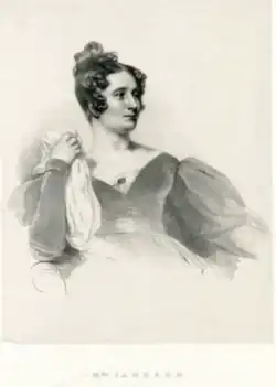 The first work which displayed her powers of original thought was her Characteristics of Women: Moral, Poetical, and Historical (1832). She used her analyses of William Shakespeare's heroines to put forward a subtle account of female virtue. This book, which later became known as Shakespeare's Heroines, was incredibly successful. Harriet Martineau remarked that "Mrs Jameson's world-wide reputation dates from the publication of this book".[3] The book was reissued 28 times during the nineteenth century alone.[4] As Anne Russell says, "So widely was Shakspeare’s Heroines read that almost every subsequent nineteenth-century writer on Shakespeare’s women characters mentions the book".[5]